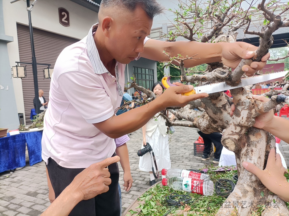 广西盆景艺术大师、桂林山水盆景元老邓于前(中)在实操现场与选手探讨水旱盆景的创作