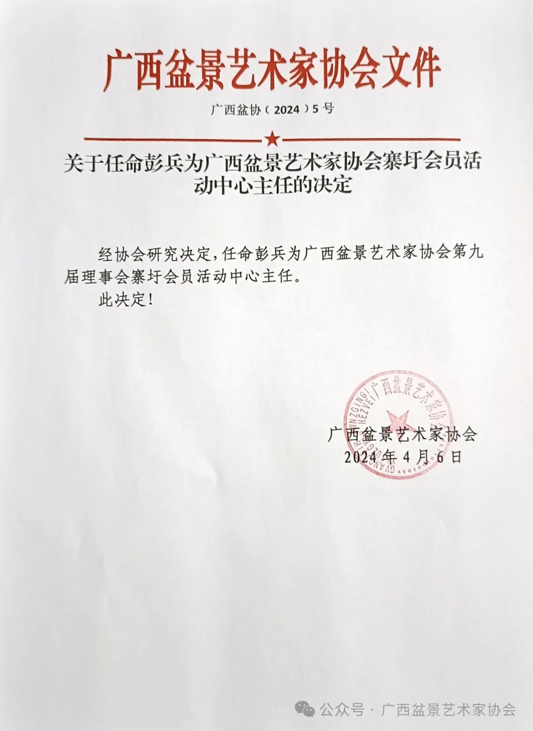 广西盆景艺术家协会常务副会长刘宁胜宣读协会相关决定和任命书