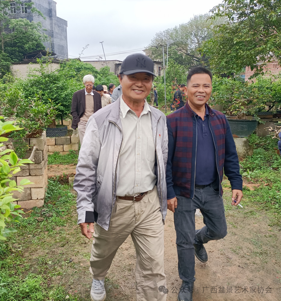 钦州的资深盆景人吴大振(左1)和罗传忠会长(右1)愉快交谈